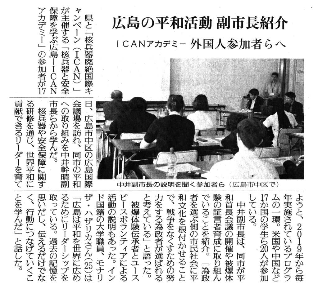 Day 4 offered a more hands-on and immersive experience, combining field visits with direct conversations. The day began with an insightful session with Mr. Mikiharu Nakai, Deputy Mayor of Hiroshima City, who spoke about the city’s ongoing peacebuilding efforts and the important role of Mayors for Peace in promoting nuclear disarmament and global cooperation. I was also interviewed by a local newspaper, where I shared my reflections on meeting the Deputy Mayor and my impressions of Hiroshima — a city that continues to embody both the pain of its past and the strength of its recovery.